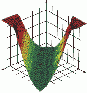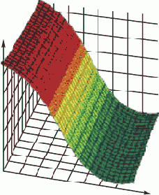 Комбинация линейной функции нескольких переменных и скалярной сигмовидной функции приводит к характерному профилю "сигмовидного склона", который выдает элемент первого промежуточного слоя. На рис. 5.1 соответствующая поверхность изображена в виде функции двух входных переменных. Элемент с большим числом входов выдает многомерный аналог такой поверхности. При изменении весов и порогов меняется и поверхность отклика; может меняться как ориентация всей поверхности, так и крутизна склона — большим значениям весов соответствует более крутой склон. Так, например, если увеличить все веса в два раза, то ориентация не изменится, а наклон будет более крутым. В многослойной сети подобные функции отклика комбинируются друг с другом с помощью последовательного взятия их линейных комбинаций и применения нелинейных функций активации. На рис. 5.2 изображена типичная поверхность отклика для сети с одним промежуточным слоем, состоящим из двух элементов, и одним выходным элементом, для классической задачи "исключающего или". Две разных сигмоидных поверхности объединены в одну поверхность, имеющую форму буквы "U".